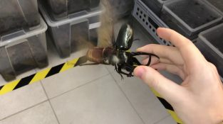 Eine große Käferarten Chalcosoma caucasus aus Malaysia, spreizt ihre großen Flügeln.