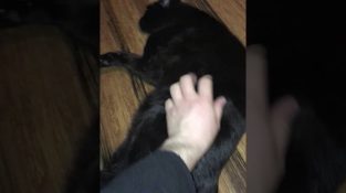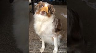 Ein Mann versucht, Käse Herausforderung in Widder Hund zu machen, ein australisches Schäfer 1 Jahr. Mit dem Feta-Käse in der Nase, Hund bleibt unbeweglich und verwirrt.
