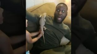 Sitzen auf einer couch, ein Mann Angst vor einer Eidechse Tennis Fuß nach oben und ein kleines Kind zu fragen, um weg schreien.