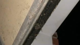 Eine Wolfsspinne (Lycosidae) trägt ihre Kleinen auf dem Rücken, als er in einen Türrahmen klettert. Aber es hält dem hohen Gewicht nicht stand und fällt zu Boden.