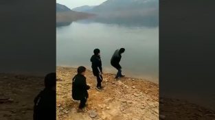 Der Versuch, seinen Vater nachzuahmen, Ein kleiner Junge wird versuchen, einen Stein ins Wasser zu werfen.