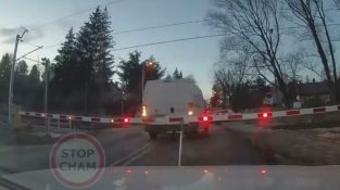 Ein LKW bleibt auf einem Bahnübergang stecken
