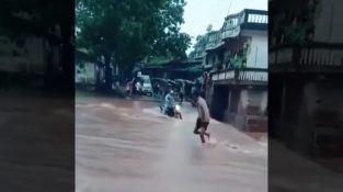 Ein Mann beschließt, sein Motorrad aufzugeben, die von der starken Wasserströmung während einer Flut weggefegt wird.