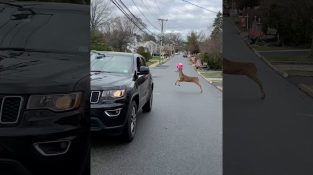 Ein junger Hirsch geht durch ein Viertel in Leonia, New-Jersey, mit einem Wasserball zwischen dem Geweih.