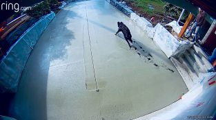 Crowley, der Hund, beschloss, einen Test mit frischem Zement durchzuführen, sobald sein Chef die Arbeit beendet hat.