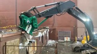 Eine Renovierung im Naturhistorischen Museum der Yale University in Connecticut, USA, wird mit Hilfe eines als Dinosaurier getarnten Baggers durchgeführt.