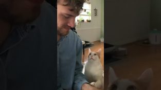 Eine Katze beobachtet ihren Besitzer, während er ein Stück auf dem Klavier spielt und singt.