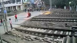 Auf einem Bahnübergang in Indien, Ein Motorradfahrer passiert die geschlossenen Schutzgitter und versucht, die Schienen zu überqueren, wenn der Zug ankommt. Es war keine so gute Idee...