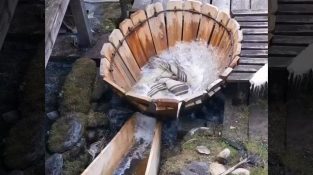 Der traditionelle „Vâltori“-Mechanismus zum Waschen von Kleidung unter fließendem Wasser aus einem Fluss in Rumänien.
