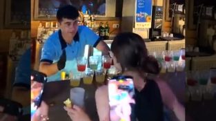 Ein Barkeeper bittet einen Kunden, ein Glas zu schieben, um einen großen Dominostein aus Trinkgläsern zu starten, übereinander. Anscheinend waren die Anweisungen nicht sehr klar.