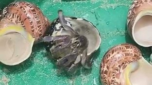 Ein freundlicher Mann hilft einem Einsiedlerkrebs, seinen Plastikdeckel zu verlieren, und bietet ihm einige Luxusoptionen.