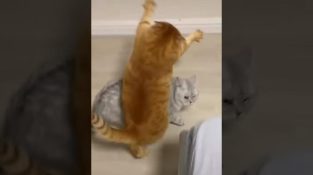 Eine Katze kommt ostentativ, um ihre Mitbewohnerin anzugreifen, eine beeindruckende Katzenbewegung machen.