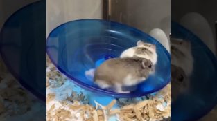 Zwei Hamster laufen zusammen auf einem Rad, wenn man aufhört sich zu bewegen. Dann springt der zweite darüber, als wäre es ein Hindernis.