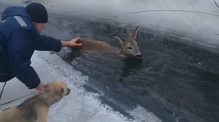 Ein Paar in Russland bemerkte einen jungen Hirsch, der in einem kleinen eisigen Bach gefangen war. Der Mann zögerte nicht, dem Hirsch bei der Freilassung zu helfen.