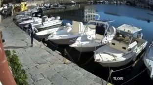 Ein Mann scheint Spaß daran zu haben, Pfähle zu brechen, die Boote an einem Hafensteg festmachen. Als er einen von ihnen tritt, es wird rutschen und ins Wasser fallen.
