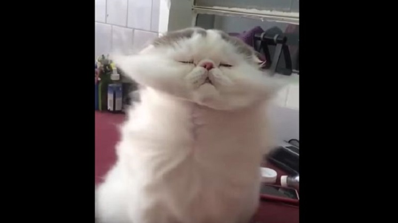 A cat appears to greatly appreciates drying the fur with an electric hair dryer. The scene fits perfectly with the song 'Died In Your Arms' by Cutting Crew.