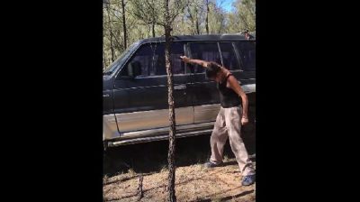 A woman trying to break the window of a Mitsubishi Pajero SUV with a hammer, because he forgot the keys inside the vehicle. quickly realizes that the task will not be easy.