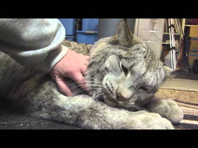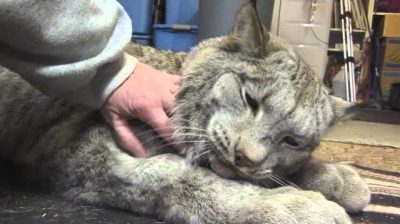 Max, a Canada lynx five years grew at zoo, enjoys the caresses of an employee goyrgoyrizontas like a cat.