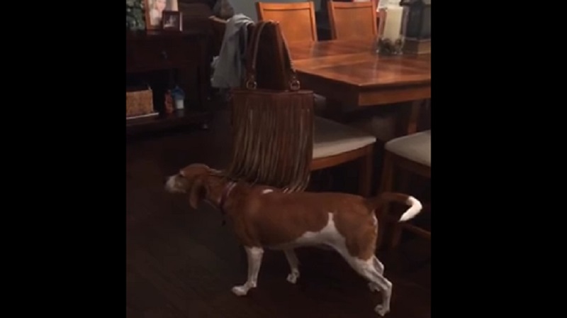 A dog enjoying the tingling sensation in the back of the fringe a feminine handbag.