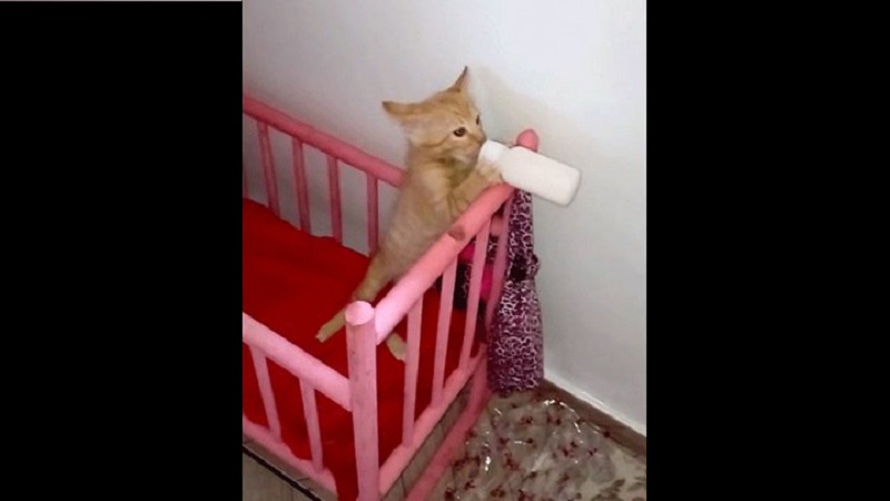 In a house in Portugal, a kitten treated like a baby. The idioktitria of, She gives him a small bottle with milk, and the kitten runs inside the crib to drink.