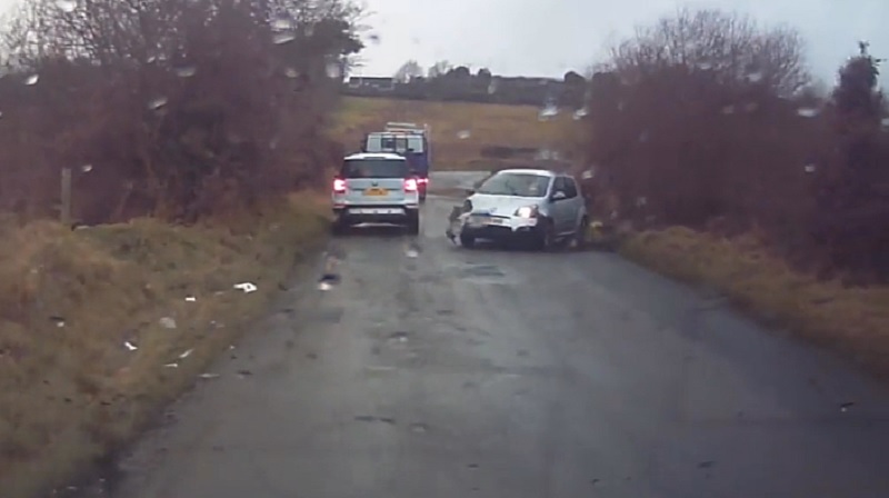 A Guide to Ireland loses control of his vehicle resulting in a ditch. After the vehicle makes a turn returns back to the road, and the driver continues on his way as if nothing had happened...