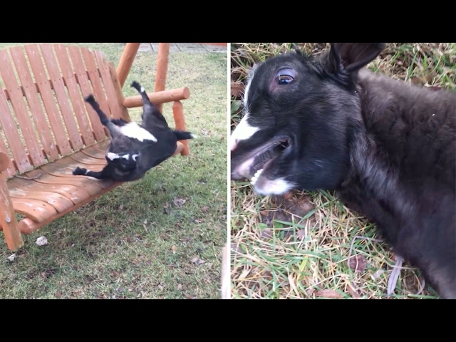 The Ricky, a pygmy goat, jumping on a swing in the garden. The Ricky suffering from myotonia, a condition that 'locks up' his muscles after intense excitement. completely kokkalomenos, , Ricky falls down with very funny way.