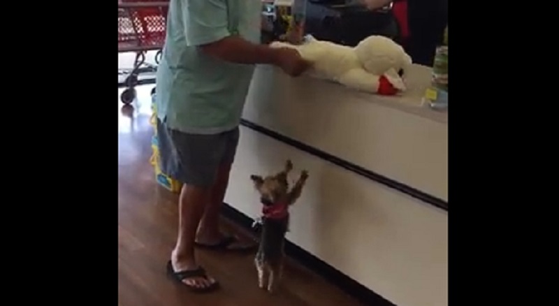 In a petsop Florida United States, Lucy, a Yorkshire dog, waiting to get her new toy. Unfortunately the stuffed sheep is too large for this, but Lucy is determined.