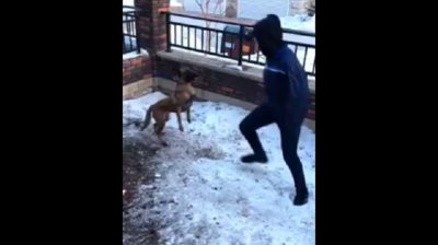 A young man finds funny tease a dog tied, until he can solve the leash.