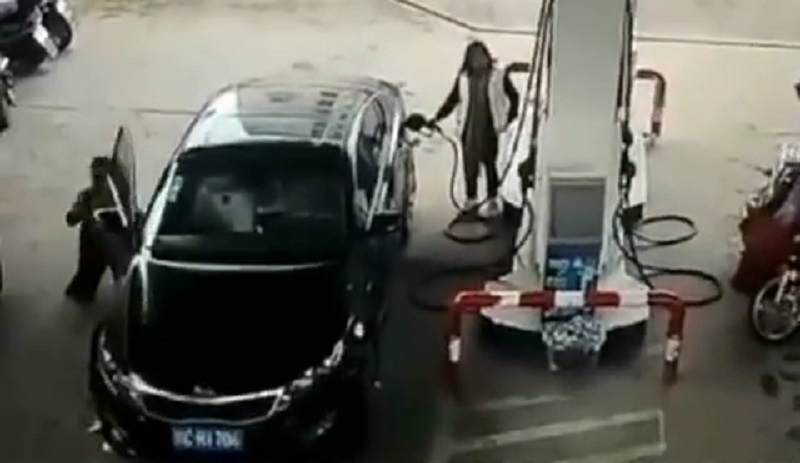 In a service station in China, a man on a scooter stealing the handbag of a woman who puts gasoline in her car. But karma will punish the thief, falling with the scooter of a few meters.