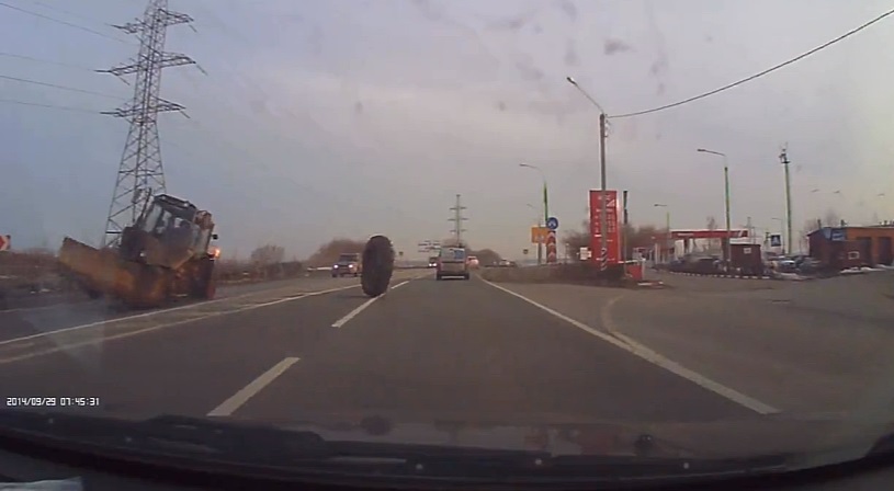 On a highway in Russia avoids a driver for a while a big wheel, which detached from an excavator oncoming.