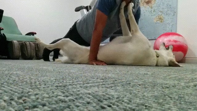 A dog watches with interest on television a group of people eating in a restaurant Suddenly one of them stretches out...