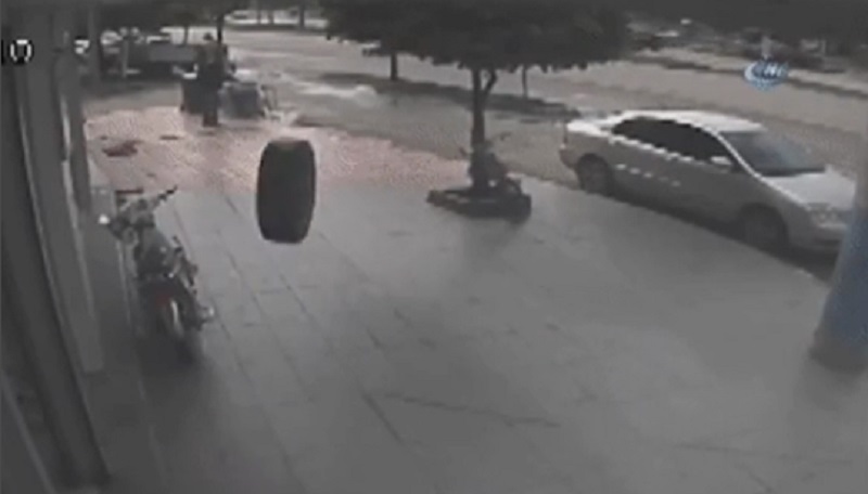 Very funny incident, wherein a wheel is detached from the shaft of a car, comes with forums in a building and ends up in the arms of an unsuspecting man.