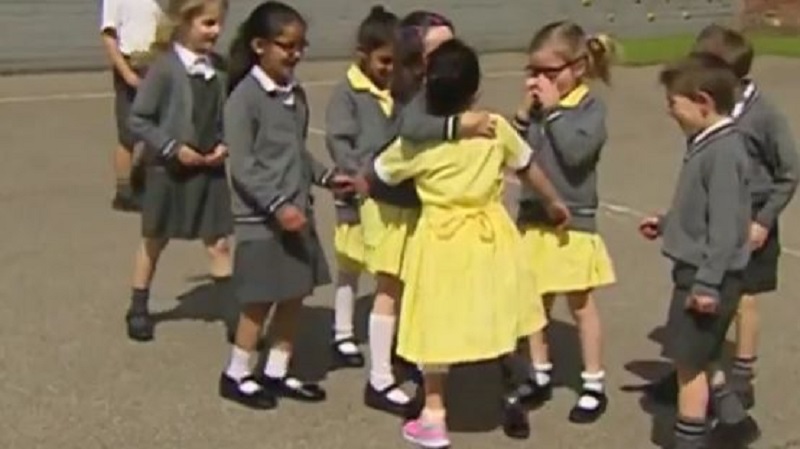 The Anu, 7chrono a girl from England with amputated leg shortly after birth, shows the new artificial leg for the first time to classmates, a Birmingham school.