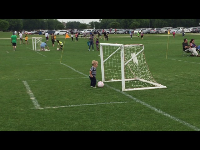 A small child playing alone in a soccer goal. Every time you put a goal, He raises his hands with enthusiasm and celebrates.