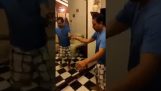 A man is alone in the house, He found a way to dance with a partner during quarantine.