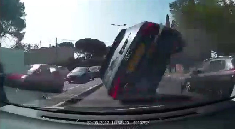 A Guide to the Israeli city Haifa tries to make overtaking between two cars. The vehicle overturned and ends do three crazy somersaults, falling onto a third vehicle, and a power pole.