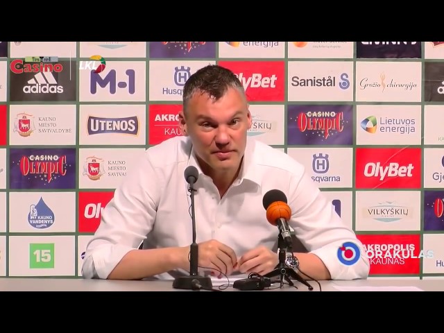 The Sarunas Jasikevicius, coach of Zalgiris basketball team in Lithuania, answers a question about the lack of Augusto Lima, who did not play because of the birth of his child. The question took place on May 20, within the semi-finals for the Lithuanian Championship.
