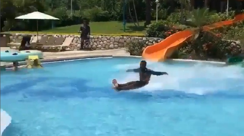 In a waterpark, a man emerging from a water slide gliding on the water surface with their buttocks. By the time you have it reaches even to the edge of the pool, impressively completing its exit from the water.