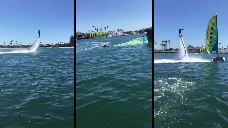 Near San Diego, a man amused throwing a Jetboard, when little beyond a catamaran boat turned over by wind. The man went close help, lifting the boat from the mast thanks to the power jetboard.