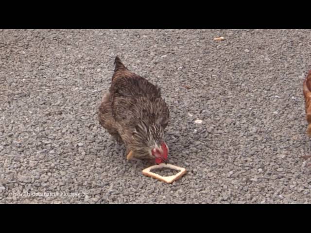 A hen trying to eat two slices of bread, but continually falls into the same trap.