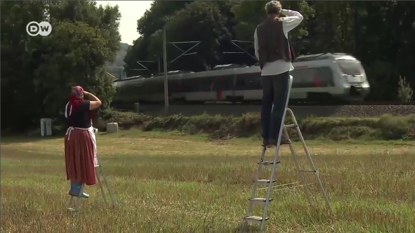 The 'Bewegtes Land' project transformed Germany's Saale Valley into a 30km-long stage, amusing passengers on transit trains. About 500 residents and volunteers participated in the Jena-Naumburg route, performing various comedic skits.