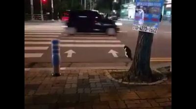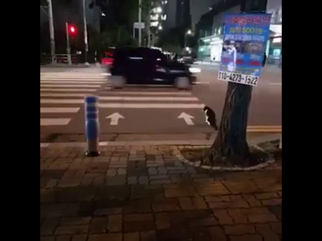 In front of a pedestrian crossing on a street in South Korea, a cat is waiting patiently to light green before passing across.