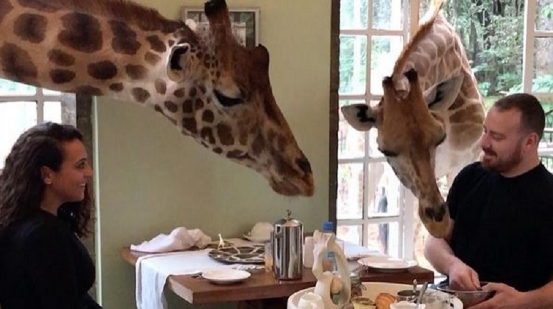 A couple eating breakfast hang out with Kelly and Margaret giraffes at Giraffe Manor Hotel in Nairobi, Kenya.
