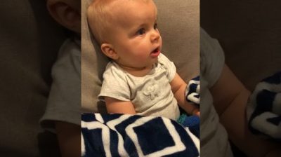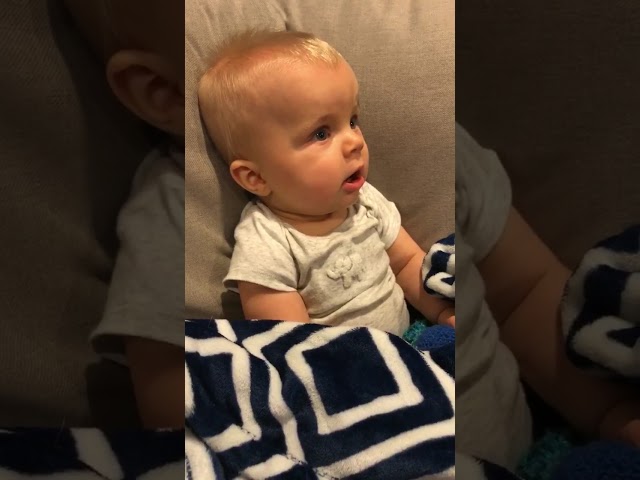 Sitting on the couch, a baby sees and hears with great questions for the first time the guitar, his dad's hands. At the end of the song, the bebis POPs an adorable smile.