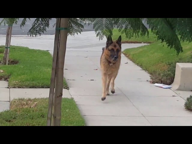 During a ride, a German Shepherd is looking for the owner of, who is hiding behind a tree.