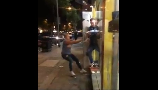 A drunken woman in wants anyway to get into a restaurant to eat a kebab. Tried several times to enter, but the officials prevented, pushing the back and away from the store. But the woman persists and I managed to break the glass door of the shop!