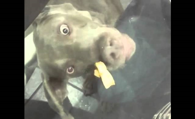 A dog doesn't understand why he can't eat the delicious fries on the glass table.