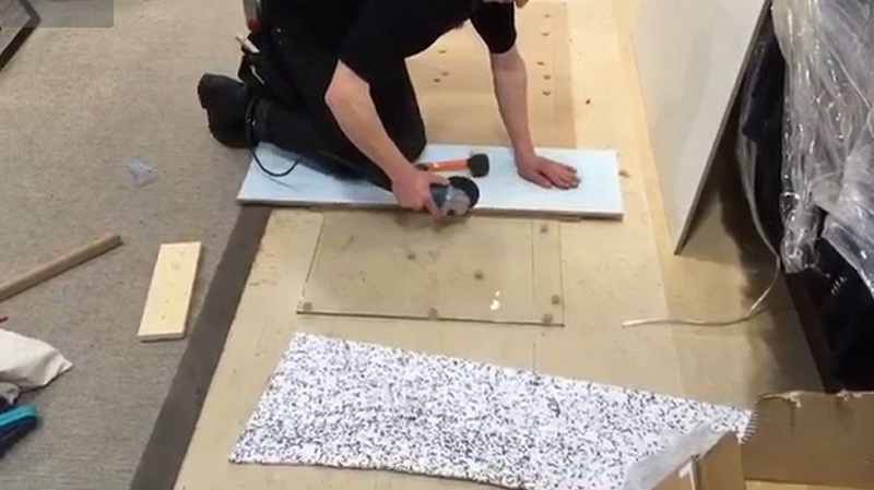In a workshop, a man shows his technique for cutting a glass security tempered glass frame, with a wheel. Driving the wheel tray along a wood, using a hammer and a small Board to separate the pieces of glass.