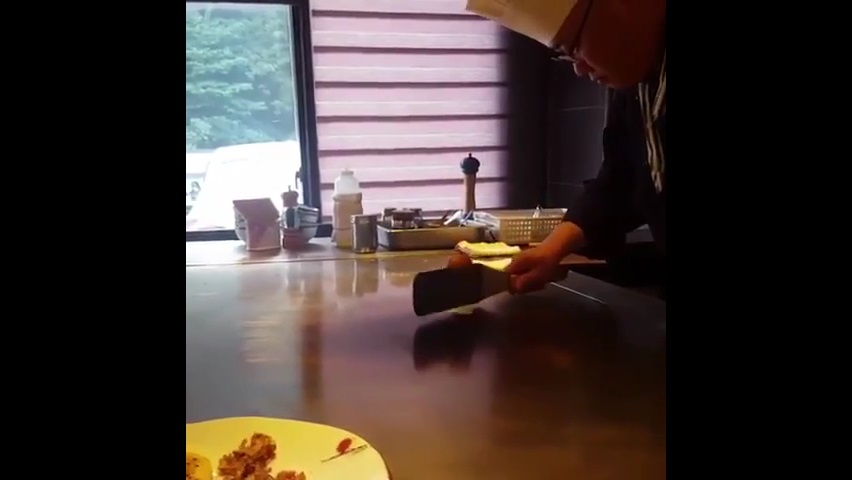 A Chinese Chef makes impressive tricks with a spatula and an egg in front of customers. Then breaks the egg onto the spatula without touching, and paint a heart.