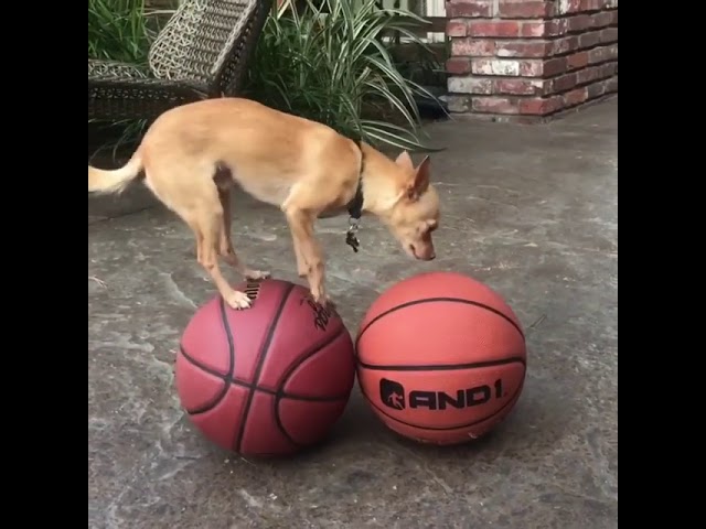 A Chihuahua mimics his boss, and climbs onto a basket ball for a spectacular acrobatic.